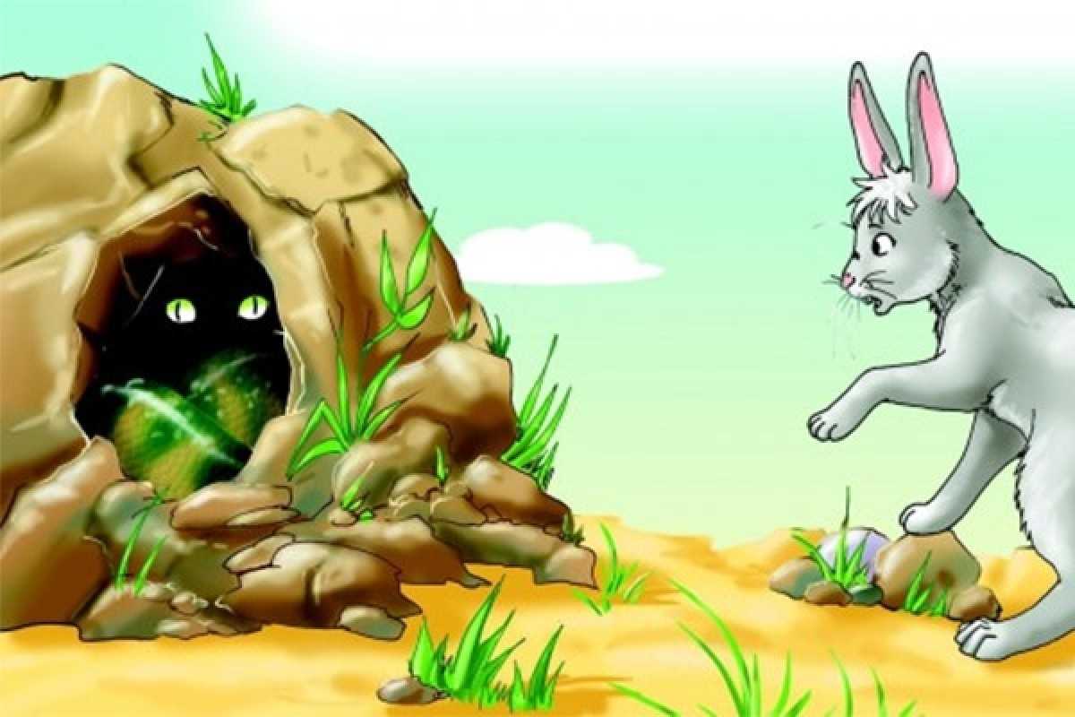 Однажды кролик гулял по лесу. Увидев голодную лисицу, он бросился бежать от нее. Добежав до пещеры в скале, кролик уже было намеревался в ней спрятаться. Но не тут-то было. Кролик был очень воспитанным и кротким. Он привык всегда спрашивать разрешения, прежде чем куда-то войти. Поэтому он вежливо спросил: «Можно войти?».