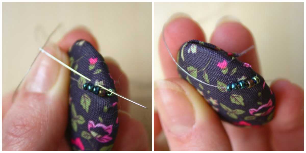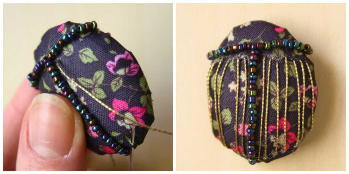 Чтобы добавить поделке большую схожесть с жуком, используйте блестящие нитки, чтобы сделать длинные стежки в промежутках между бусинами.