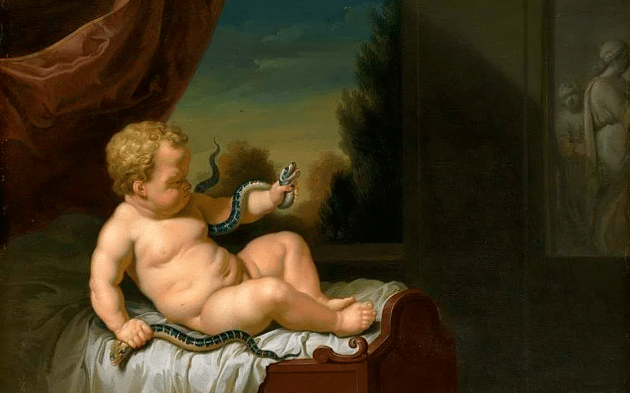 Гера не оставила попыток погубить мальчика. Однажды ночью она наслала змей, чтобы они задушили в колыбели новорожденного Геракла. Но как только они хотели обвиться вокруг тела малыша, он схватил их своими маленькими ручками. Испуганная мать и няньки, бросившись к колыбели, увидели ребенка, который крепко держал огромных умирающих змей.