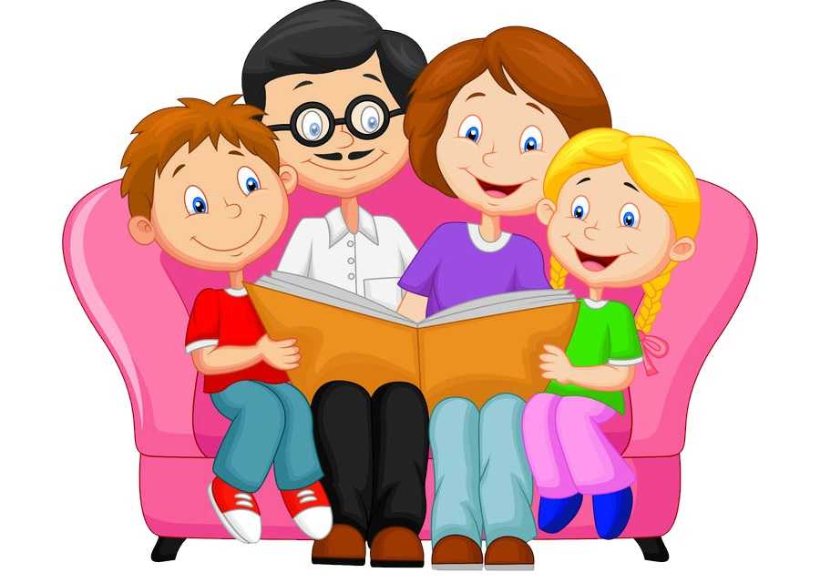 Вот семья, которая собралась на диване. Родители читают книжку детям — редкое зрелище, я вам скажу.