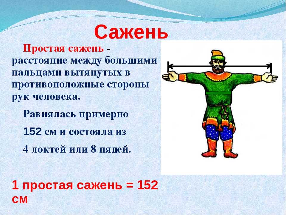 Сажень — одна из наиболее распространенных на Руси мер длин. Слово «сажень» происходит от глагола сягать, досягать – на какое расстояние можно было дотянуться рукой.