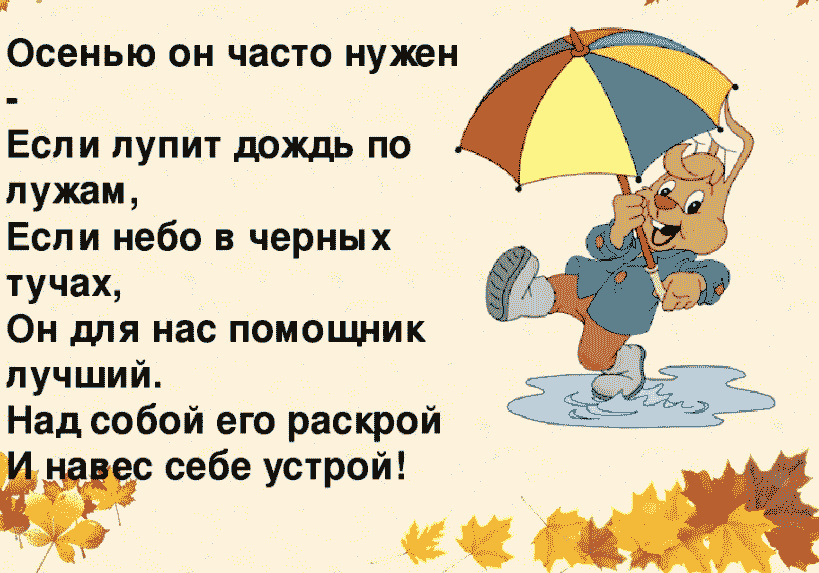 | Разноцветная дуга Поднялась за облака, Выше дома, выше горки, Выше самой длинной елки. Ярко под дождем сверкала, А затем совсем пропала. Что за странная дуга? Это просто (радуга) |