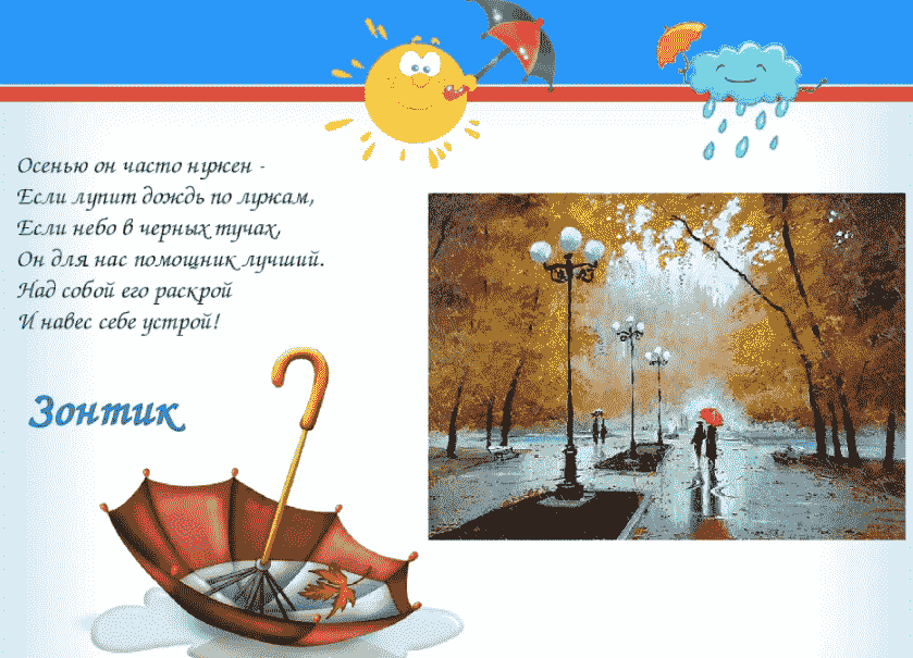 | Ох, шумела, ох гремела, Напугала всех она, И леса и огороды, Всей округе полила. (Гроза, дождь) |