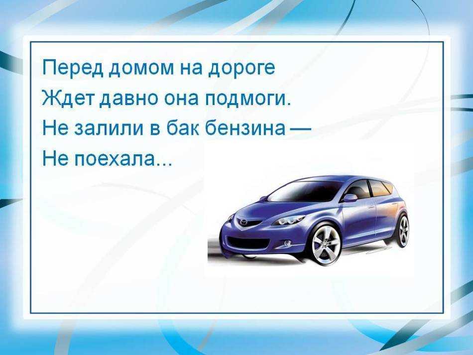 Пью бензин и масло ем, Хоть не голодно совсем. А без них я так болею, Что поехать не сумею! Ответ — автомобиль.