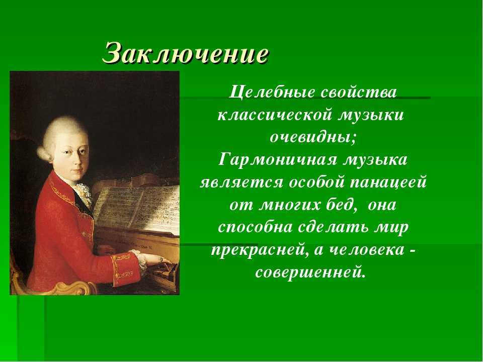 Мы уже упоминали, что ученые провели ряд исследований о влиянии музыки на человека, и было доказано, что музыка великого маэстро обладает уникальным дизайном симметрии, удивительной гармонией и воспроизводит ритм биения сердца. И именно эти свойства стимулируют головной мозг, вызывают положительные эмоции, уменьшают напряжение и раскрывают творческий потенциал.