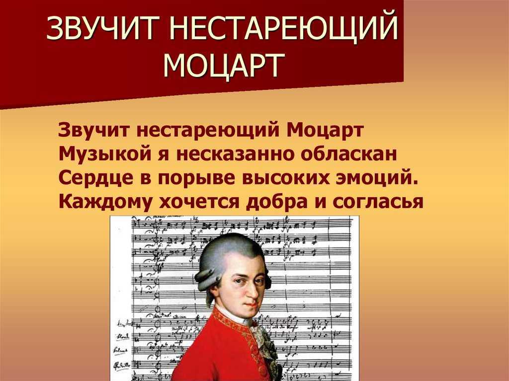 Надеемся, что эта статья вызвала у вас желание слушать Моцарта. В Канаде на государственном уровне на городских площадях играют произведения Моцарта (чтобы снизить количество аварий).