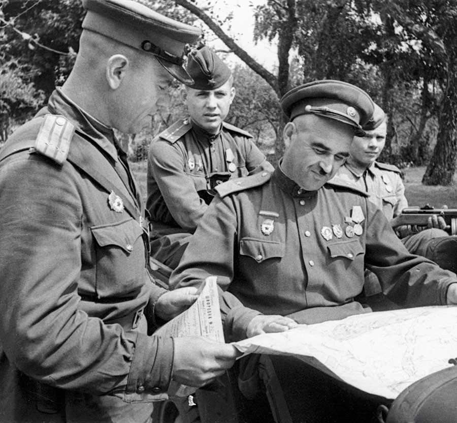 - Командир 15-го Стрелкового корпуса генерал-майор Иван Ильич Людников (справа) рассматривает карту во время боевых действий на Орловско-Курской дуге